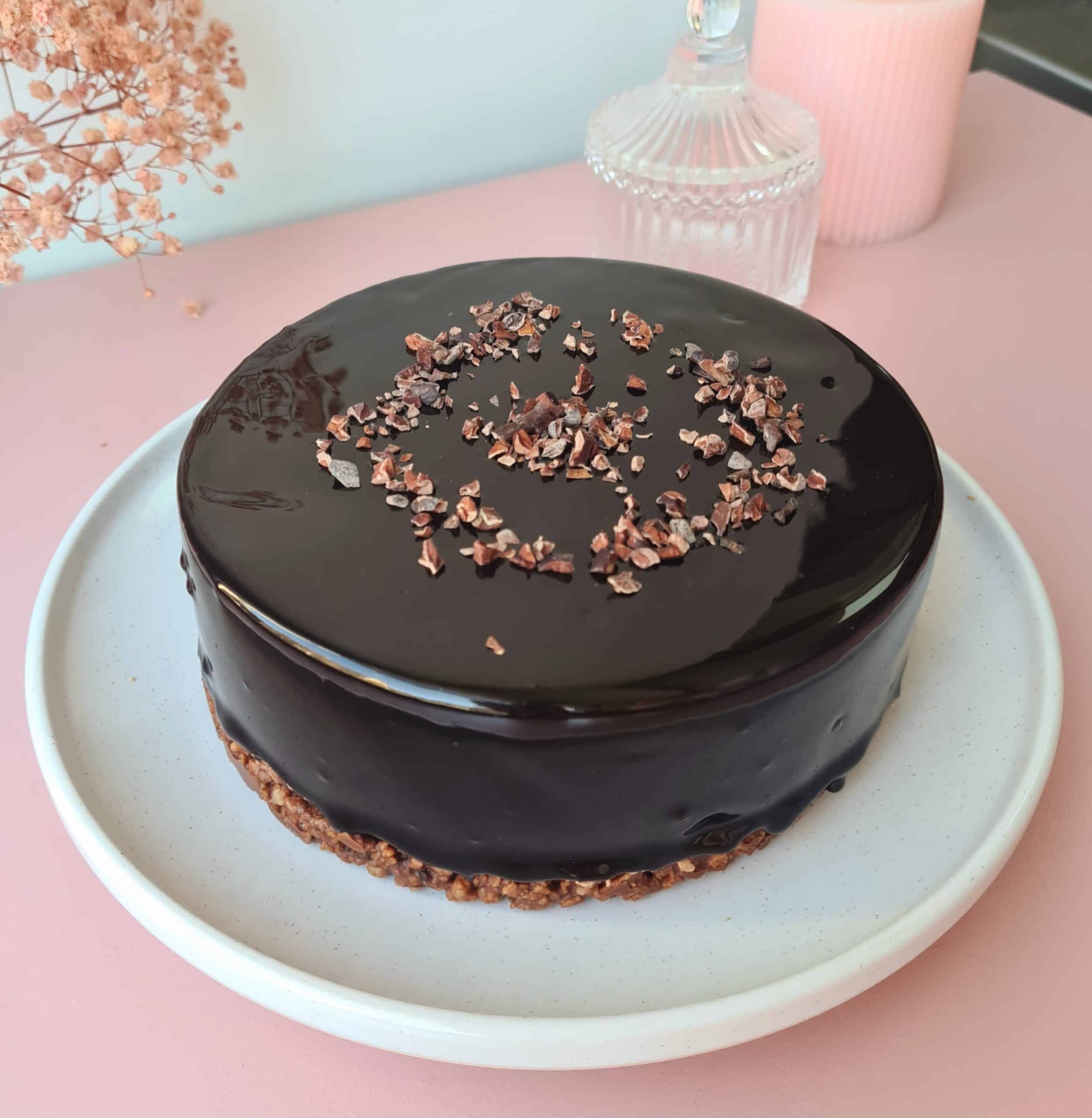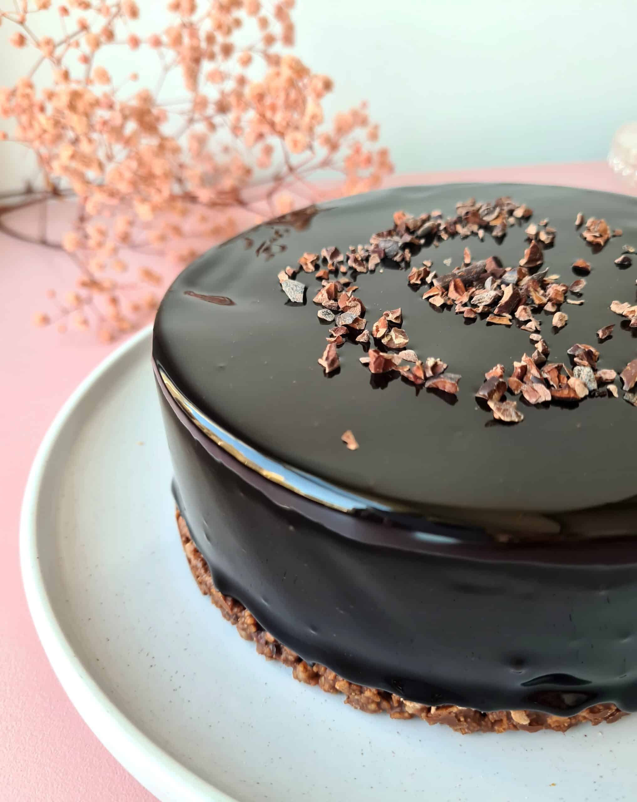 Sablé au grué de cacao– caramel de chocolat noir – mousse chocolat noir – biscuit cacao – glaçage au cacao